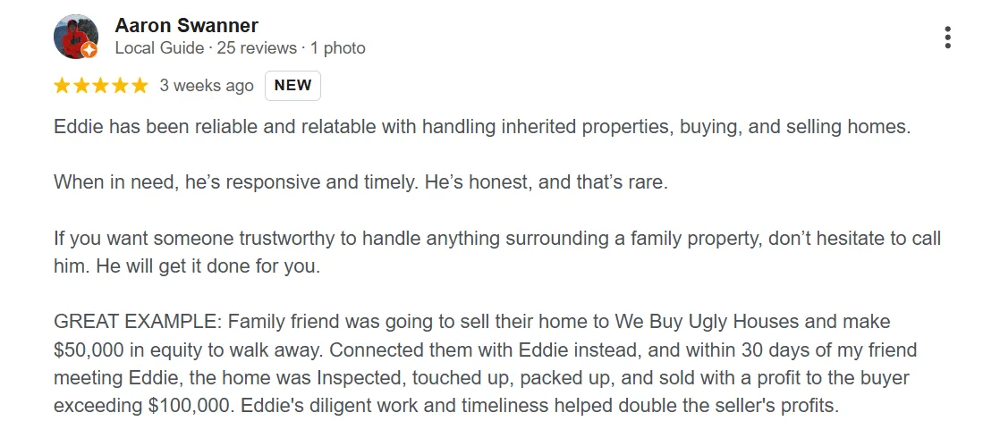 “After my father passed away, Eddie bought my dad's house for what we considered a fair price. Eddie cleaned the house out and made many home improvements. He invited us back to see the finished product which was amazing. Eddie was great to work with through the whole process. We would highly recommend doing business with him and his company!”